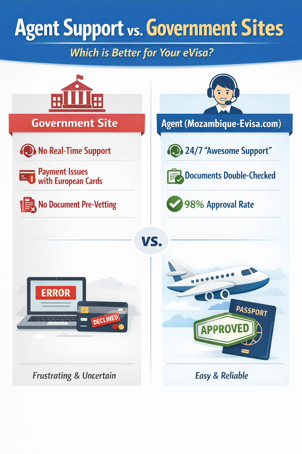 Agent (Mozambique-Evisa.com): Offers 24/7 "Awesome Support," double-checks your documents for errors before submission, and provides a much higher approval rate (98%) with a user-friendly interface.